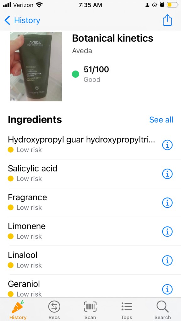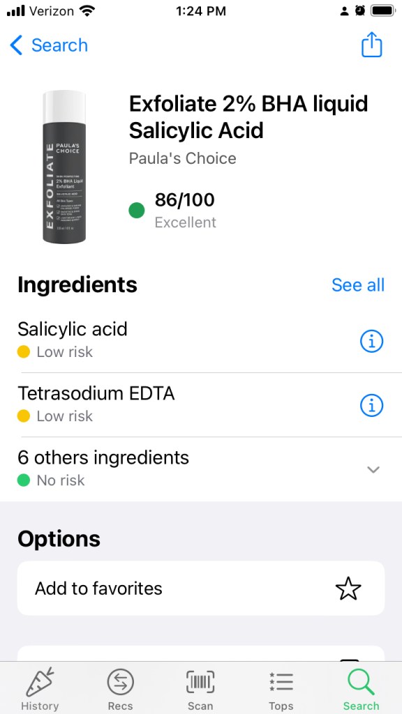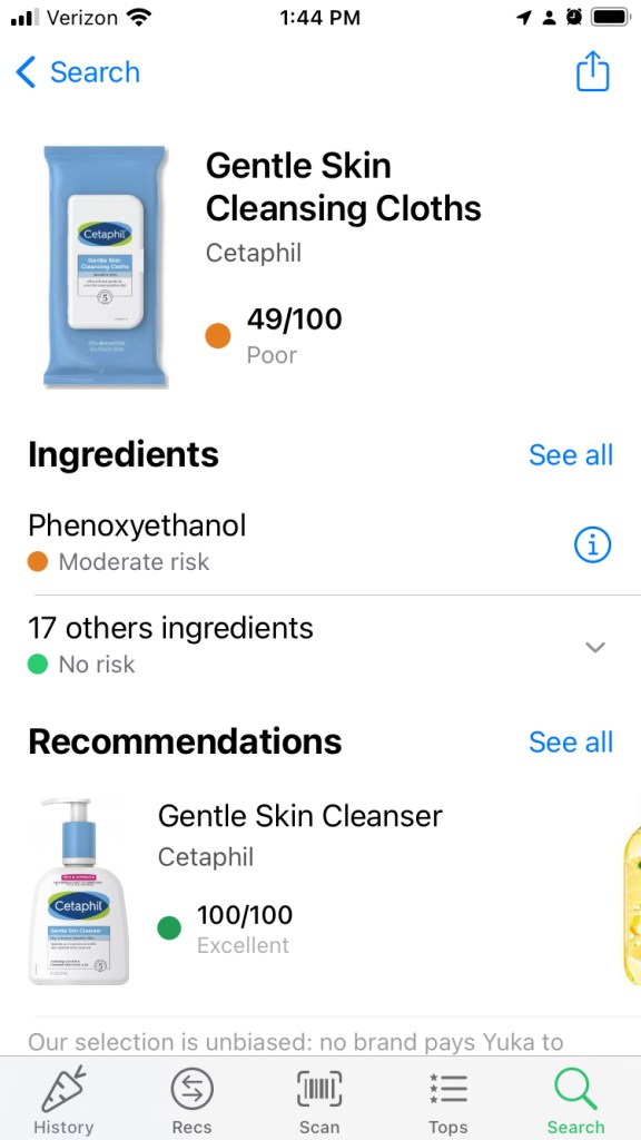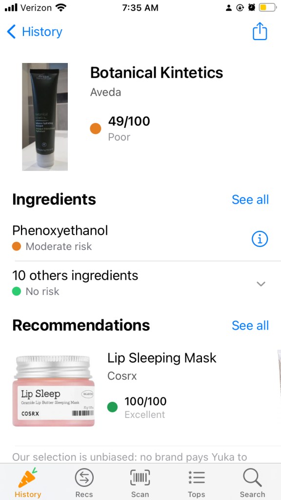 In Yuka(1), you scan the cosmetic or food product’s barcode with the app’s scan/camera option and BOOP! The product will show all its good and bad ingredients, which ones are low and high risk and it recommends alternative products.